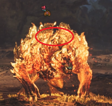 | 前脚[弱点] | 90 | 90 | 90 | 0 | 25 | 10 | 20 | 15 | 0 | | 赤 | 尻尾を2回叩いてから両前脚を地面につけて振動を発生させ、前方に溶かした地面を浴びせる攻撃後に出現します。 |